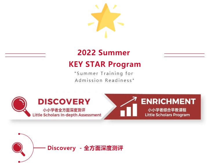我们非常理解家庭在首次面对私校测评时的迷茫,为了帮助家长们准确掌握孩子目前能力水平,充分了解私校对低龄学生的关键考察点,从而最大化利用剩余的时光做好针对性的准备,KEY特别设计了 Summer STAR Progam, 包含Discovery 与 Enrichment 两个环节。