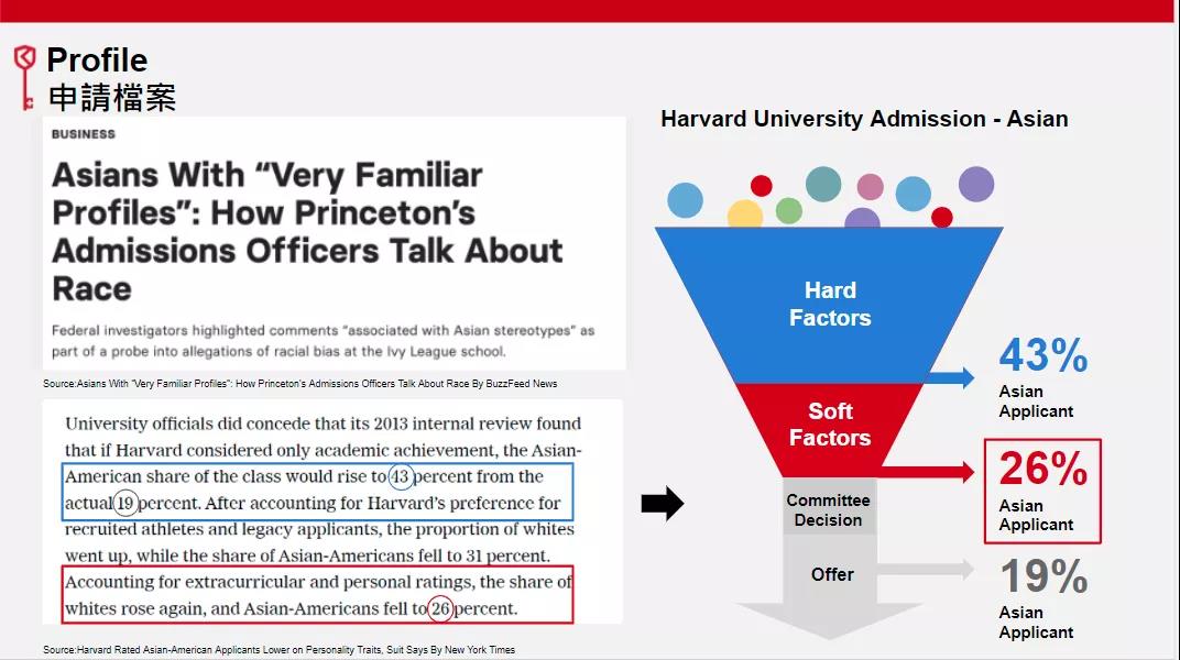 在北美的个性化教学环境下,大学希望每个申请者都具备不同的个人特色。故通过“软实力”差异每个申请者,以便挑出更符合要求的申请人。而对亚裔而言:导致43%的亚裔申请人滑落至19%的原因正是综合档案过于相似,从而错失良机。换句话说,亚裔申请人想要被梦寐以求的大学录取,申请档案一定要具备个人特色。