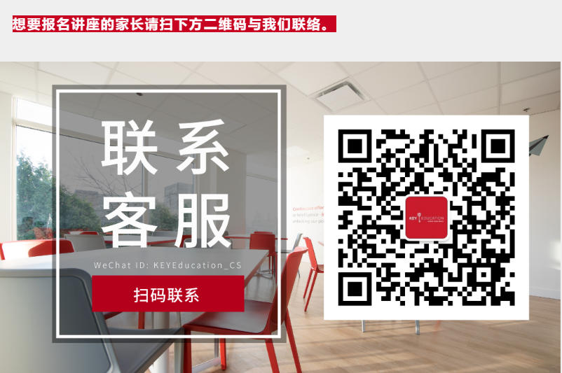 同时,由于每个家庭的情况不同,准备的方向和策略也有差异。KEY也为家长们准备了一次免费的顾问咨询会议。由我们专业的申请顾问团队,在了解您与孩子的具体情况后,再给与针对性的建议,从而帮助您找到自己家庭申请准备的正确方向,快扫二维码联系客服预约吧。