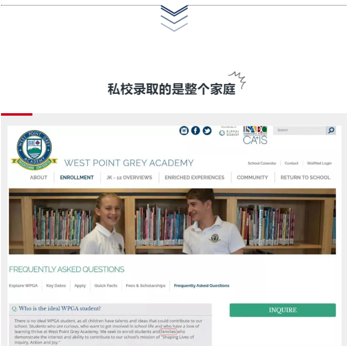 如WPGA官网上的常见提问的第一题:「谁是WPGA理想中的学生?」在回答中学校也清楚说明了:「我们正在寻找能够展现出兴趣与能力,对我们学校的教学宗旨做出贡献的学生和家庭。」可见,学校并不单单只是录取一位学生,而是一整个家庭。想要成功进入私校,您要准备的不只是孩子的能力培养,家长的准备工作同样重要,私校将通过审核您的家庭档案来评估您的家庭的教育理念是否与学校宗旨一直,以及您的家庭能否为学校做出贡献。