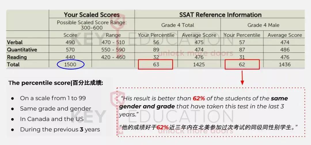 首先,私校审核SSAT成绩,并不会简单的只看考试分数。例如,Elementary Level包含了G3,G4的考生,如果单看分数,将不同年级学生一起比较并不公平。为了更公平的对比,私校重点考察成绩单上的“百分比成绩”。