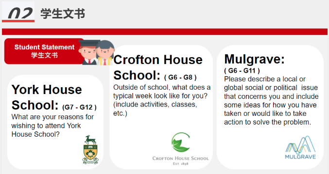 除了递交材料以外,中学申请者还要以文书的形式回答校方提出的一系列问题,例如“你为何选择我们学校?”“你平时如何安排自己的课余时间?”等,通过这些问题,学校可以对学生个人的情况与特质建立初步的了解,同时判断学生对申请本校是否有着充足的热情。
