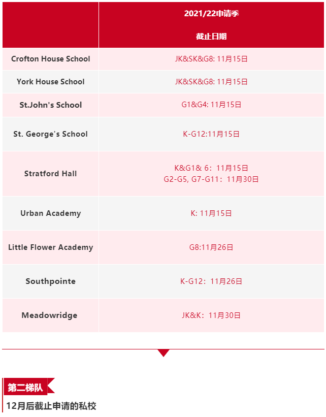 2021-22申请季的第一批私校截止日已经到来,包括St John’s School(JK&K),Southridge(K),West Point Grey Academy(K-G12), 已经在11月1日截止报名。仍计划在今年申请私校的家长需要格外留意目标院校的申请截止日,以免错失机会。为此,KEY特别为各位家长整理了目前仍然开放申请私校的截止日期。