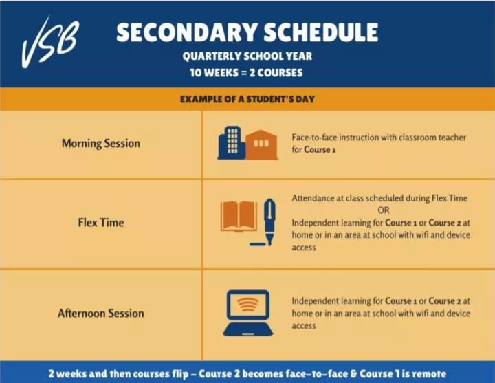 公校依照教育厅的公告与原先BC教学大纲的设置,小学生的课程将会设计更多的户外课程,学生将全天在学校内上课,中学生的课程将通过上午校内学习以及下午远程学习的方式进行,将一学年分为4个阶段,每10周学习两门常规课程,同时各校依照有需要的学生提供"弹性时间",使学生可以持续进行大学先修课程(AP),以及国际文凭课程(IB)等特殊课程,若是选择不返校的家庭,家长则需要负起安排孩子学习进度的责任。