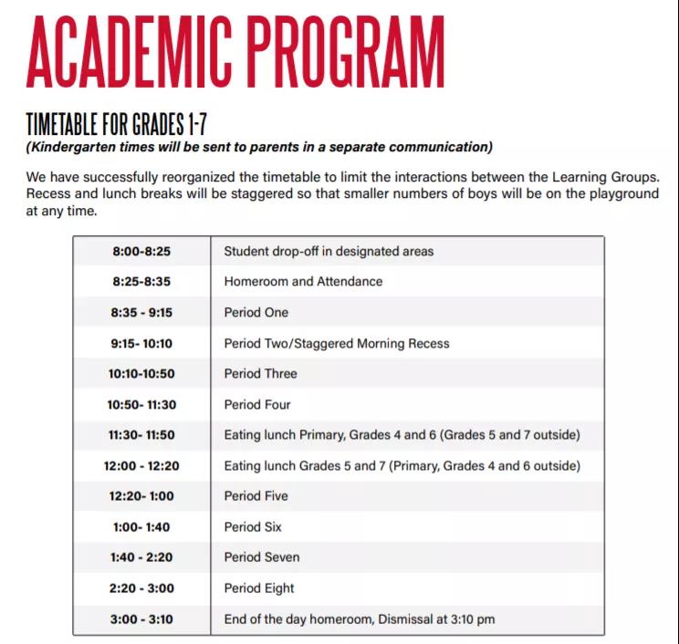 私校由于本身就强调低师生比的配置,因此私校对于安排上有更弹性的操作空间可以进行班级的设置,甚至许多私校的学习小组人数都是远低于BC教育厅所规定的上限人数的,除此之外为了让学习小组的政策可以着实落地,St. George's School还特别设计了彩色识别证来帮助学生分辨各自的学习小组,降低与小组外人员的接触。