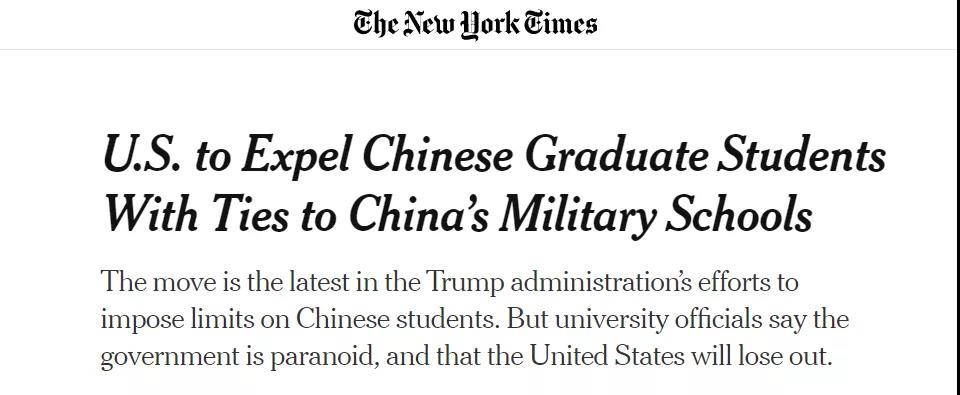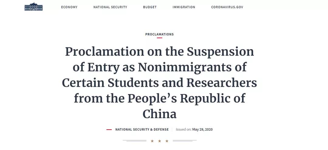而今年因为疫情的影响,美国不仅为了控制疫情而收紧签证政策,限制国际旅行,并且在5月份也一并正式宣布了对华留学生签证政策的调整。该计划宣布取消曾有中国军方合作院校教育背景的中国研究生们在美的学习签证,预计会驱逐3000名左右中国硕士留学生。而此计划也在6月1日经川普总统签署生效。具体内容请见美国白宫之官方网站: