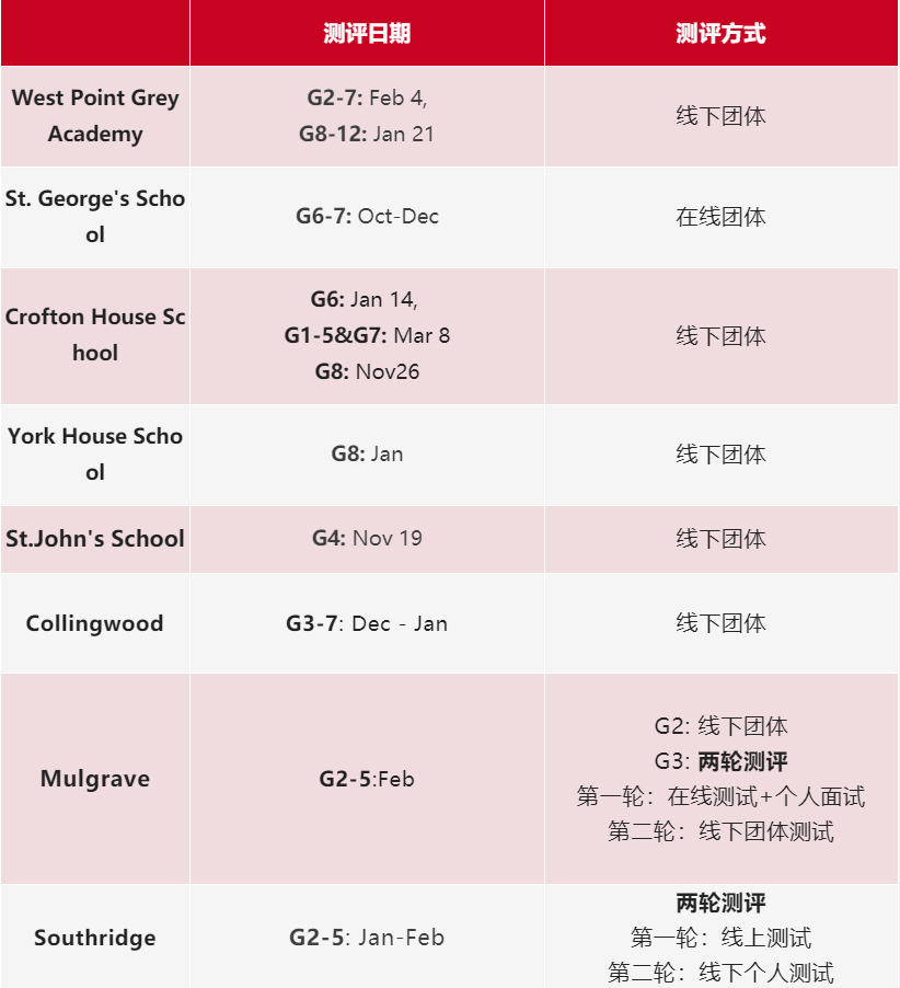 从上表的信息中可以发现,今年绝大多数私校都采用了线下团体测评。甚至有部分私校如Mulgrave甚至采用了两轮测试,第一轮先让学生完成在线测试, 再邀请通过的学生参加线下团体测评,做进一步的筛选,充分体现出私校对于测评环节的重视。 私校认为,这样的测评形式能够更好的帮助老师考察每位学生的综合能力。