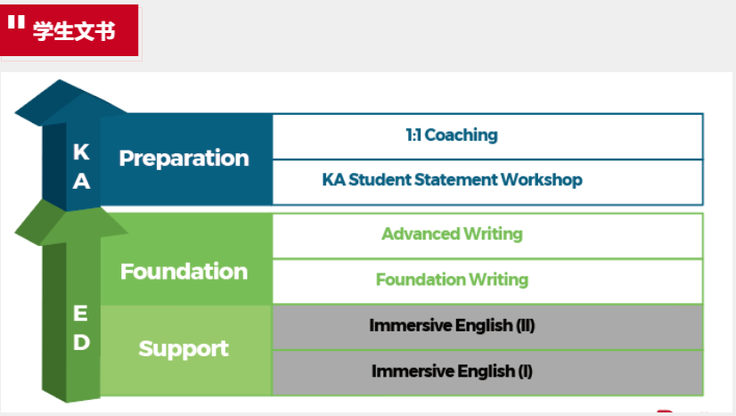 优秀的写作能力是完成高质量文书的基础。在KEY,我们会根据学生在入学评测中的表现,安排他们参加符合当前能力水平的沉浸式英语课程(Immersive English) 或基础/进阶写作课程(Foundation/Advanced Writing),进行有针对性的提升,确保他们拥有撰写合格文书的能力。