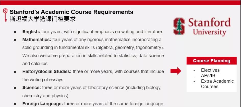 如上图,排名前10~30的美国院校在成绩上都有各自最基本的硬性指标。而除了平常在校成绩要保证以外,更有AP课程,SAT考试,课外课程等等因素用来证明申请人的学术能力。不仅如此,很多家长忽略了高中四年的课程规划的重要性。往往美国顶尖院校对申请人高中选课有着明确的要求,比如斯坦福:
