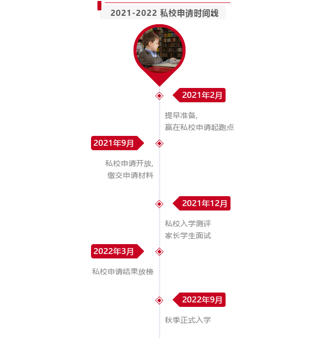 通常私校都是在9月开放下一个学年9月入学的申请,若您预计在今年进行私校申请,对照目前时间节点为2021年2月,您将在2021年9月递交私校申请书,并且在2022年2-3月收到申请的结果,最后在2022年9月正式入学。