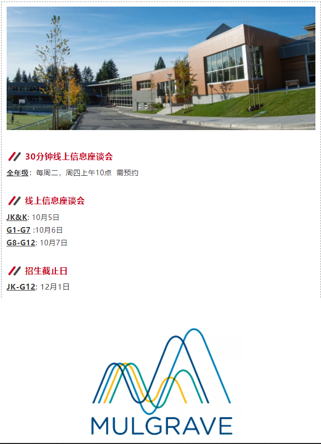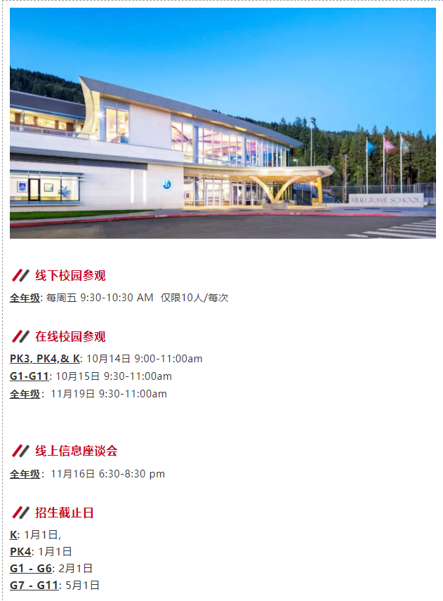 于此同时,部分私校如York House School和Mulgrave都重新启用了线下校园参观。申请家庭可在学校代表的带领下进入校园、感受学习氛围、参观教学设施并与招生人员交流对谈。然而,出于安全考量,私校对于校园参观的人数有着严格的要求,名额有限,有需求的家长建议您立刻前往学校官网预约。