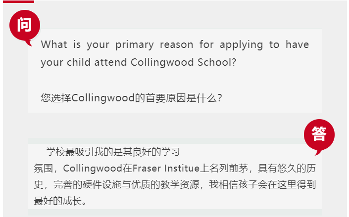 这是面试中最经典常见的问题,许多家长在回答的时候都会谈到学校的排名高,教学质量好,名气大等等。然而,这样的泛泛的回答缺乏针对性,即便把学校从Collingwood 换成 Mulgrave,也可以采用同样的回答。这类型的答案招生官早已在面试中听过了无数次了,反而会留下家庭没有对学校深入了解的负面印象。