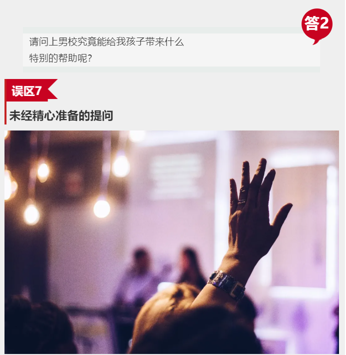 有些家长在面试前认真做了功课,把学校网站上提到的教育理念,特色课程与课外活动安排全部背下来了,希望通过展现对学校的熟悉来获得招生官的好感。然而,招生官难道会不熟悉自己学校的特色内容吗?通过这个问题,招生官真正想要了解的是这些内容与您家庭教育需求之间的关联。究竟有什么原因是您非得把孩子送到本校不可?学校的教育理念与您家庭的理念又有哪些匹配的地方?这些在回答中并没有呈现出来。