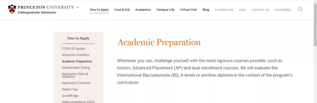 在普林斯顿大学的官网中说明了:“只要有可能,就用最严格的课程自我挑战,例如:荣誉课程、AP或是双主修。我们也将评估课程的背景如IB, A-levels或者其他的文凭。”