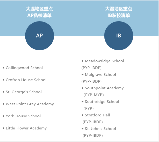家长在选择学校的时候,若以获得IBDP文凭为目标,就得确认所就读的学校是否提供IBDP课程,这边也整理出大温地区重点AP与IB课程的清单给各位做参考: