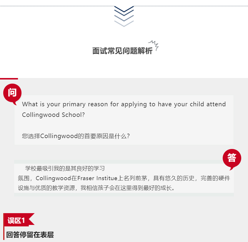 这是面试中最经典常见的问题,许多家长在回答的时候都会谈到学校的排名高,教学质量好,名气大等等。然而,这样的泛泛的回答缺乏针对性,即便把学校从Colloingwood 换成 Mulgrave,也可以采用同样的回答。这类型的答案招生官早已在面试中听过了无数次了,反而会留下家庭没有对学校深入了解的负面印象。