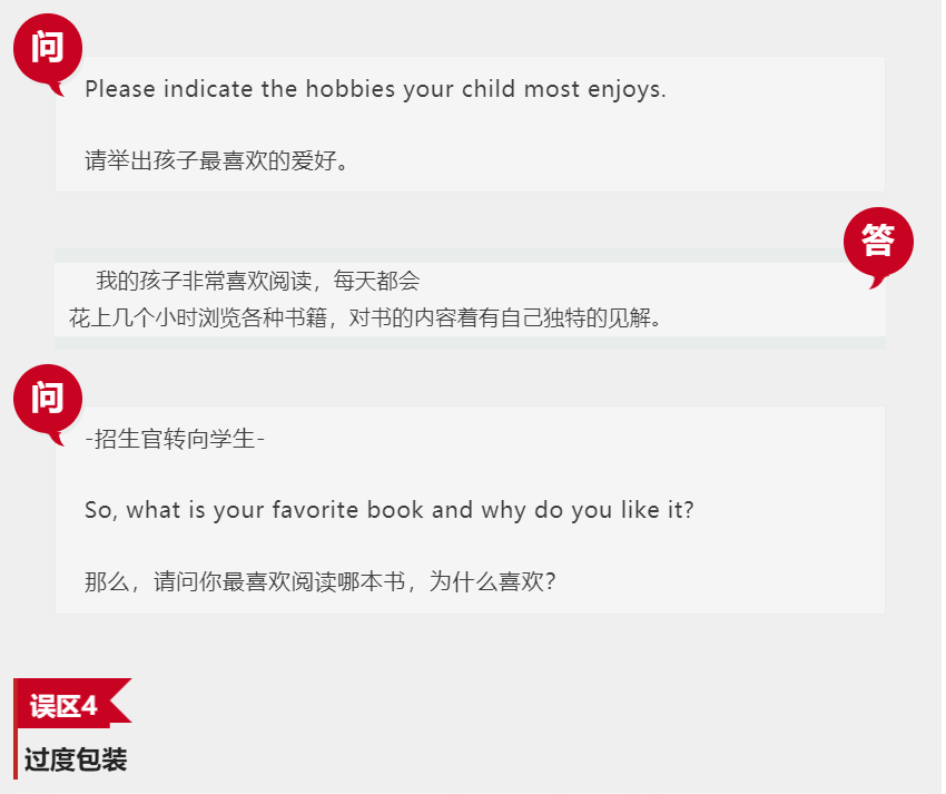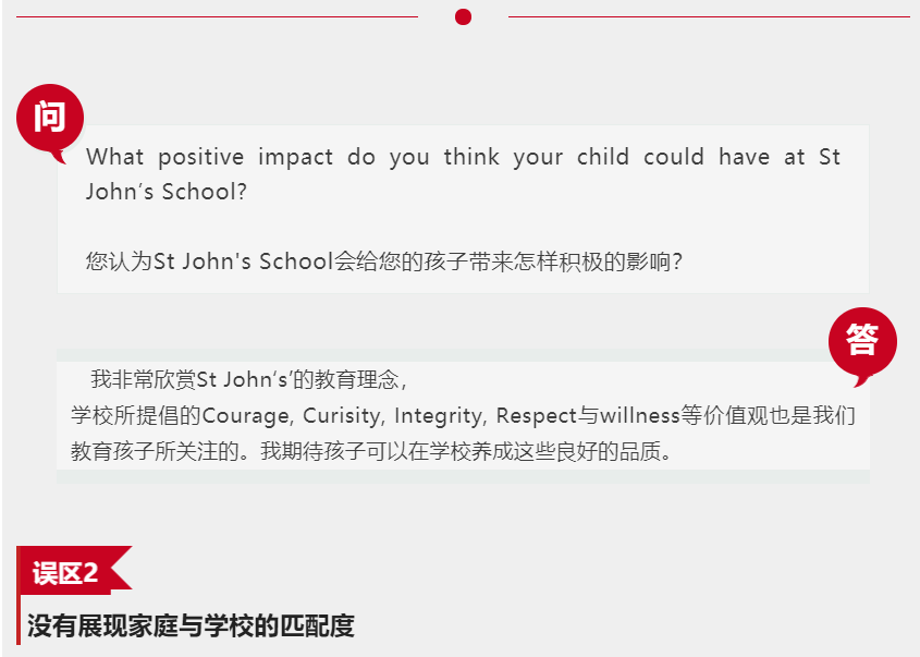 有些家长在面试前认真做了功课,把学校网站上提到的教育理念,特色课程与课外活动安排全部背下来了,希望通过展现对学校的熟悉来获得招生官的好感。然而,招生官难道会不熟悉自己学校的特色内容吗?通过这个问题,招生官真正想要了解的是这些内容与您家庭教育需求之间的关联。究竟有什么原因是您非得把孩子送到本校不可?学校的教育理念与您家庭的理念又有哪些匹配的地方?这些在回答中并没有呈现出来。