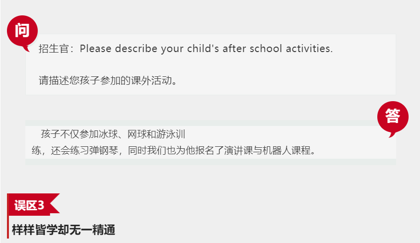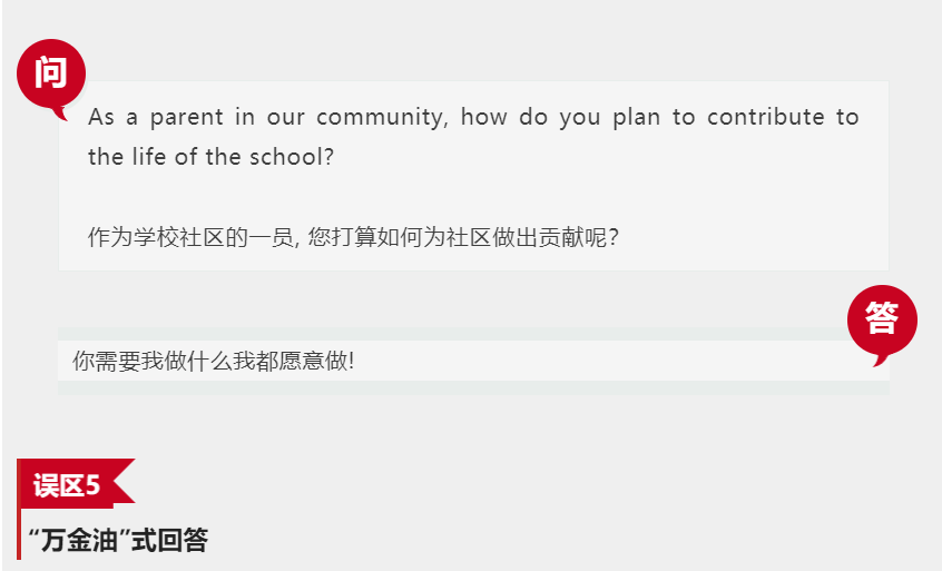 有些家长为了保守起见,采用了“万金油”的方式回答问题。然而, 这样的回答看似表达出了对学校社区支持的高度意愿,但在招生官耳里听起来却是会认为家长不清楚自己能够为学校带来什么样的贡献。