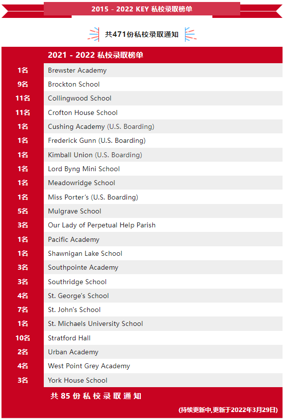 眼下,大温各大私校也开始持续放榜。截止目前,KEY共收到了85份私校录取通知,还有更多的offer正在路上啦!恭喜诸位金榜题名的家庭,非常感谢大家一直以来对KEY的信任。过去一年来的努力在今天换来了可喜的结果,您的成功就是我们最满意的答卷!