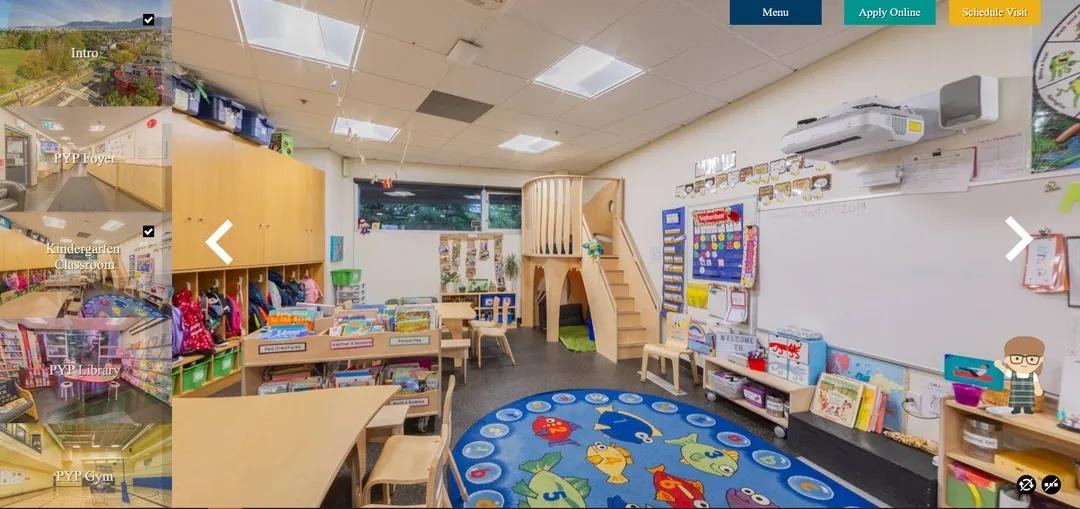 除此之外学校也提供了线上的360虚拟实境访校软件,生动的带领您在网路上一览学校的教学设施与特色项目。