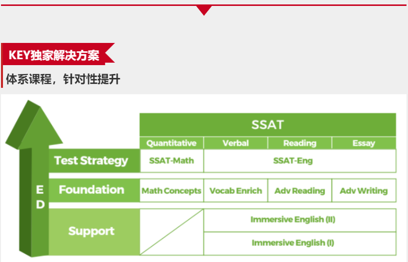 有些家长听到SSAT考试,下意识就是把孩子送进各种“提分班”中。然而,要达到有效的SSAT提分,并没有所谓的捷径,需要仰赖是稳扎稳打的努力,为此,KEY系列课程将依照SSAT的四大考察能力作为核心,分阶段帮助学生进行提升。