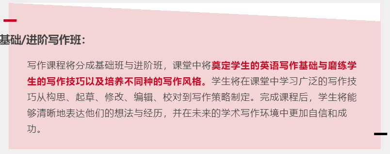 优秀的写作能力是完成高质量文书的基础。在KEY,我们会根据学生在入学评测中的表现,安排他们参加符合当前能力水平的英语课程或基础/进阶写作课程进行有针对性的提升,确保他们拥有撰写合格文书的能力。